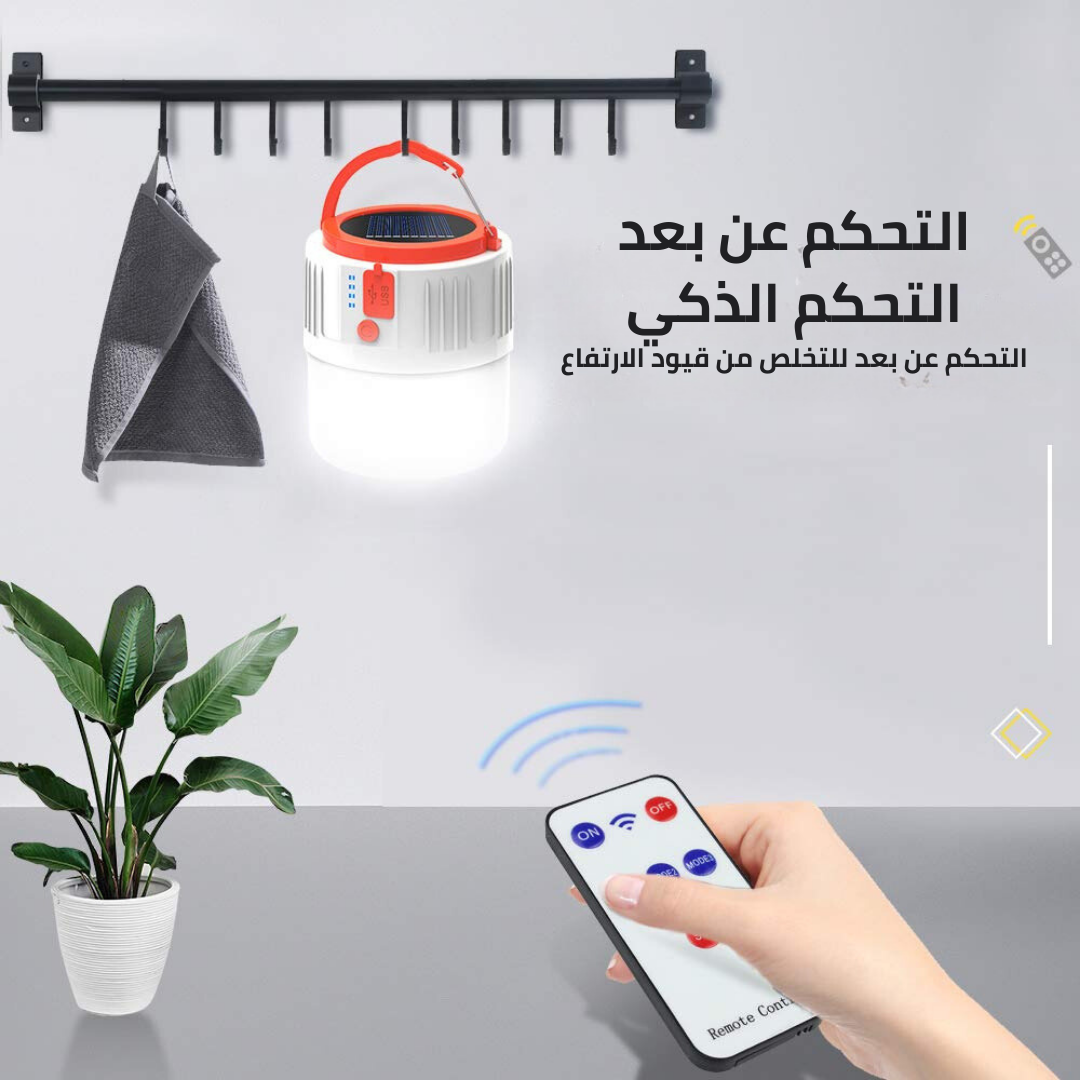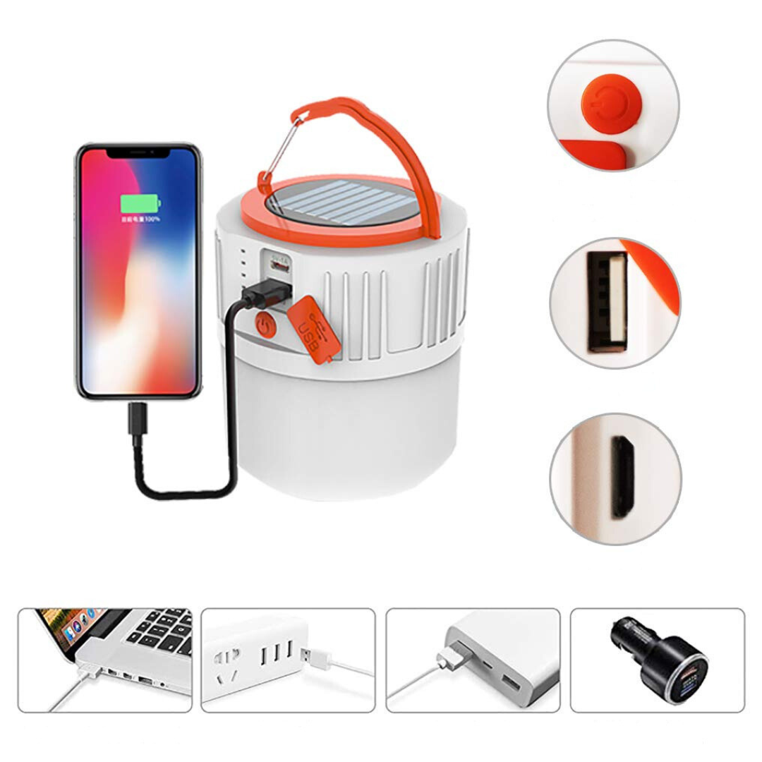 Lampe de camping LED très brillante avec batterie rechargeable de 5000 mAh, antichoc et étanche. Il dispose d'une télécommande et de 5 modes d'éclairage, et peut être chargé par câble USB ou par énergie solaire. Parfait pour les kits d'urgence et de survie.