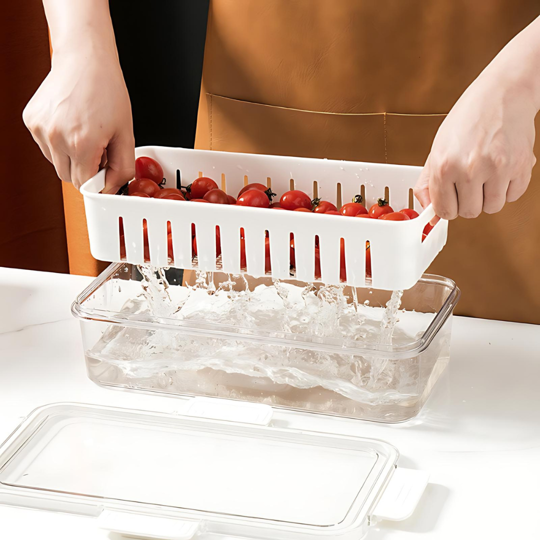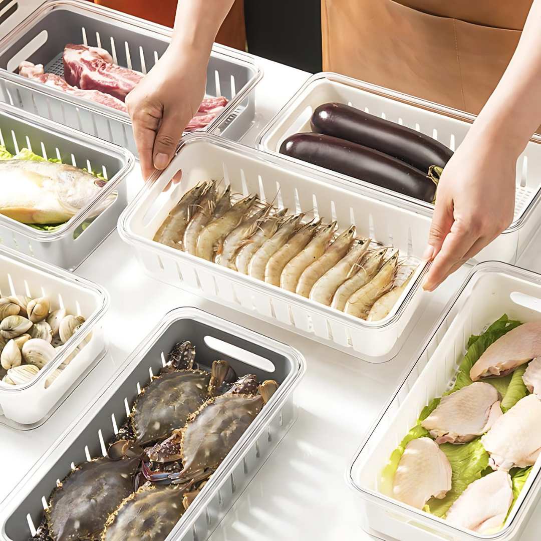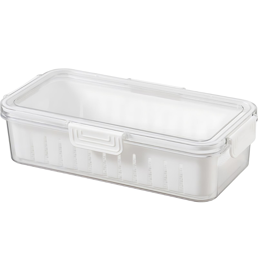 حافظ على نضارة وترتيب ثلاجتك مع علبة التخزين المزودة بسلة تصريف داخلية وتصميم قابل للتكديس. مثالية لتخزين الفواكه والخضروات بشكل منظم وفعال.