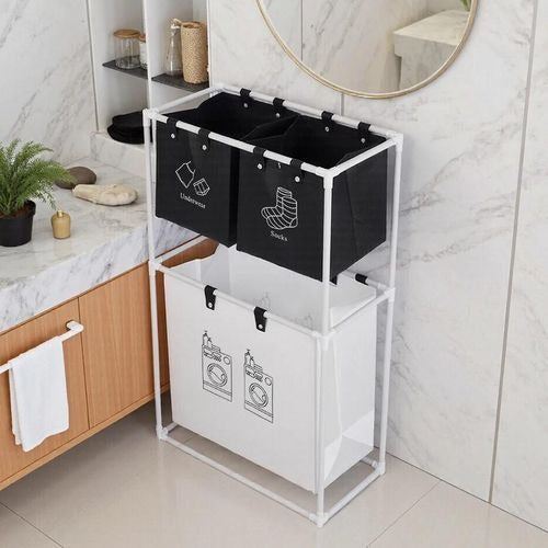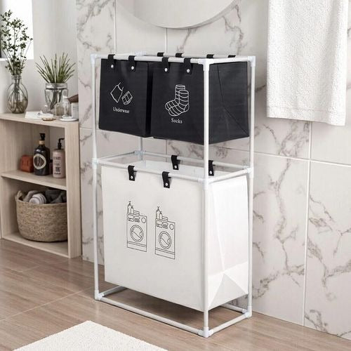 نسّاي ديك تمارة ديال الفرز قبل كل تصبينة. مع 3 ديال الصيكان كبار ومعزولين، كل حاجة كتلاح ديريكت فبلاصتها: واحد للبيض، واحد للكحل، واحد للألوان، وواحد للملابس الحساسة أو حوايج الدراري. التصبين عمرو كان بهاد السهولة